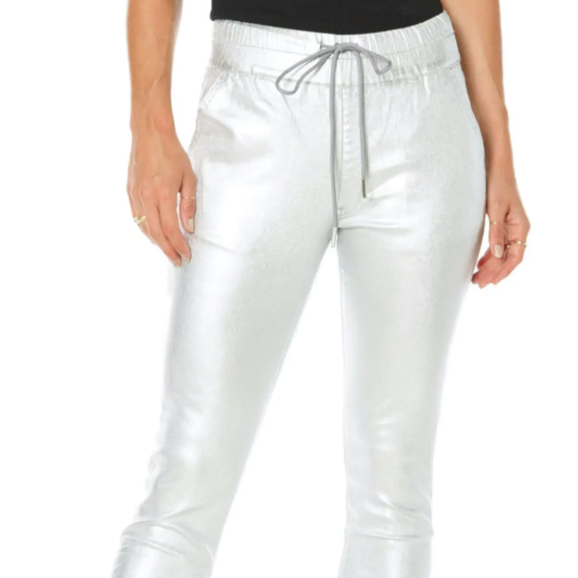 Juicy Couture Silver Foil pants will be your new favorite pair. Lightweight fabric, coated with a fun metallic accent, and features an elastic waistband, drawstring detailing at the waist, and two side pockets.