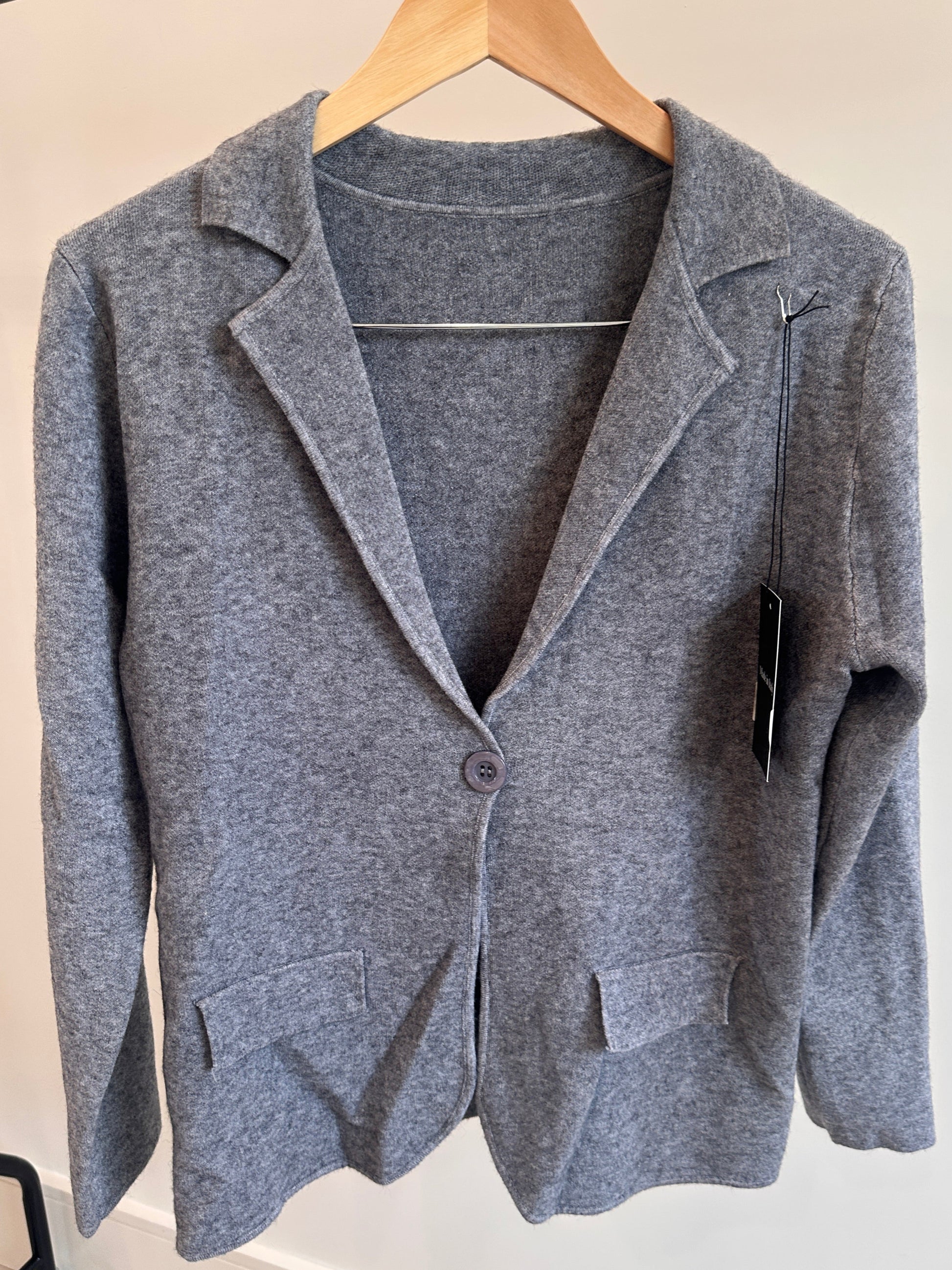 This versatile knit blazer, available in classic grey, tan, and black, is the perfect blend of comfort and style for fall. Featuring a sleek one-button closure, it offers a polished look while maintaining a soft, cozy feel; the tailored design ensures a flattering fit, making it a chic addition to any wardrobe