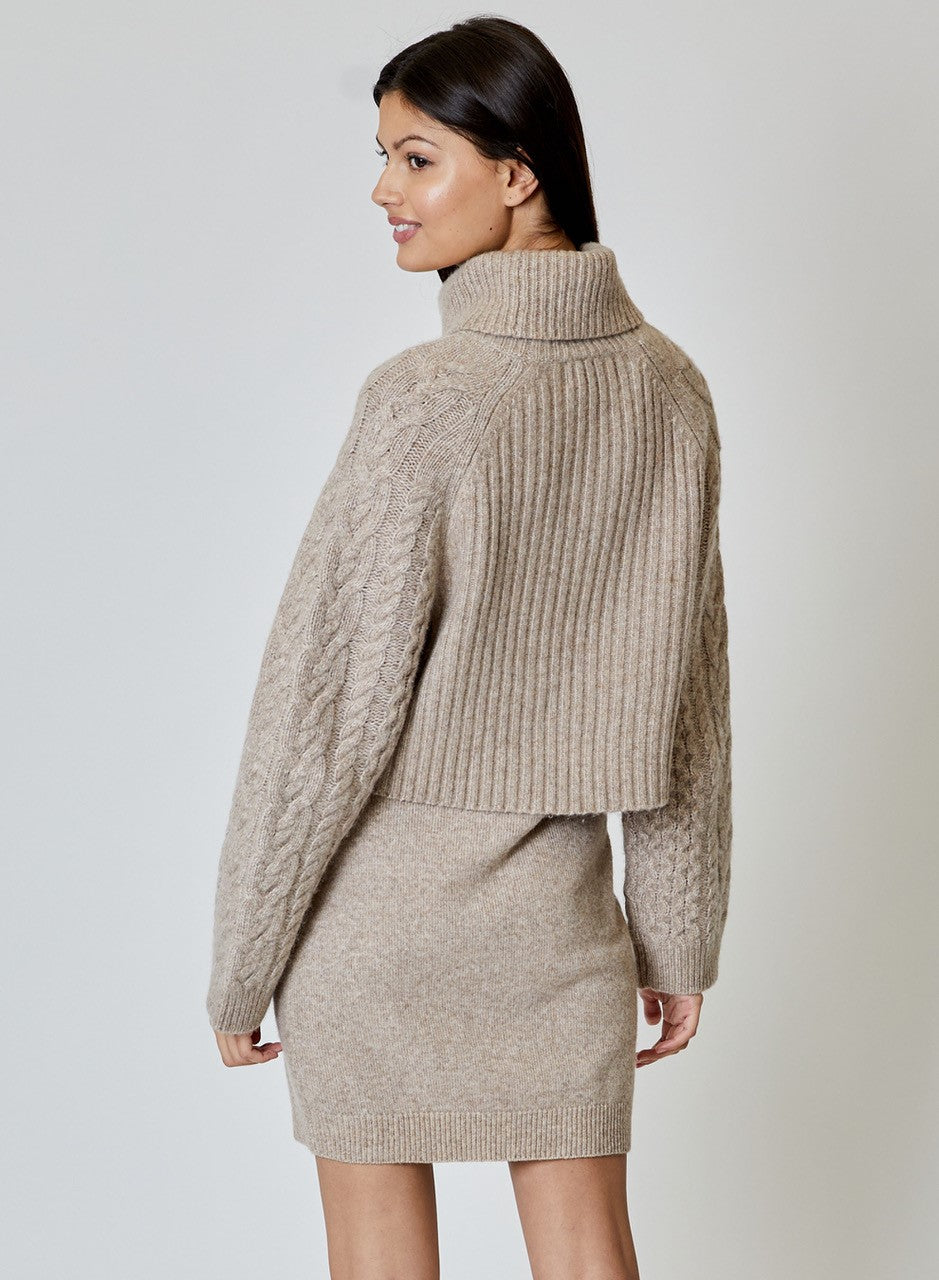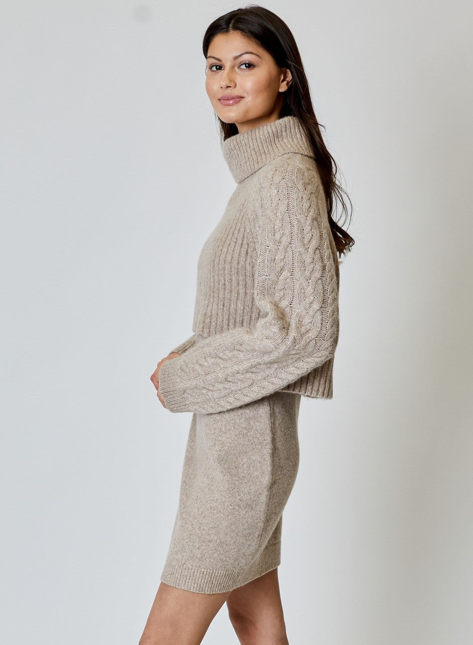 Two piece set with boxy, raglan turtleneck and fitted dress.