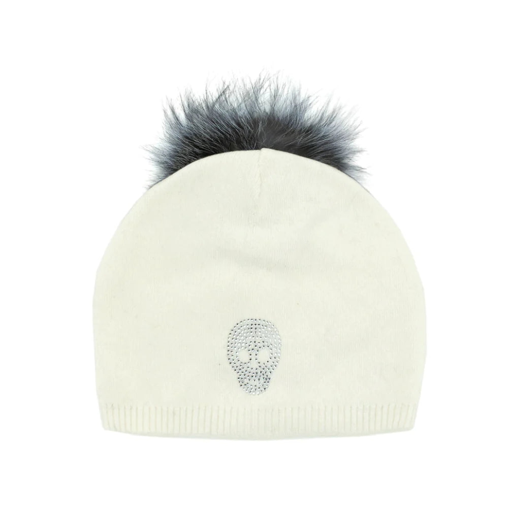 A slouchy-fit fox fur pom hat with crystal skull embellishment.