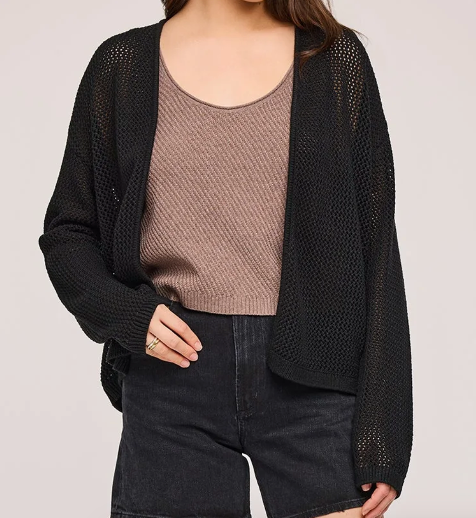 The Toledo cardigan is made of a soft yarn in an open knit pattern.