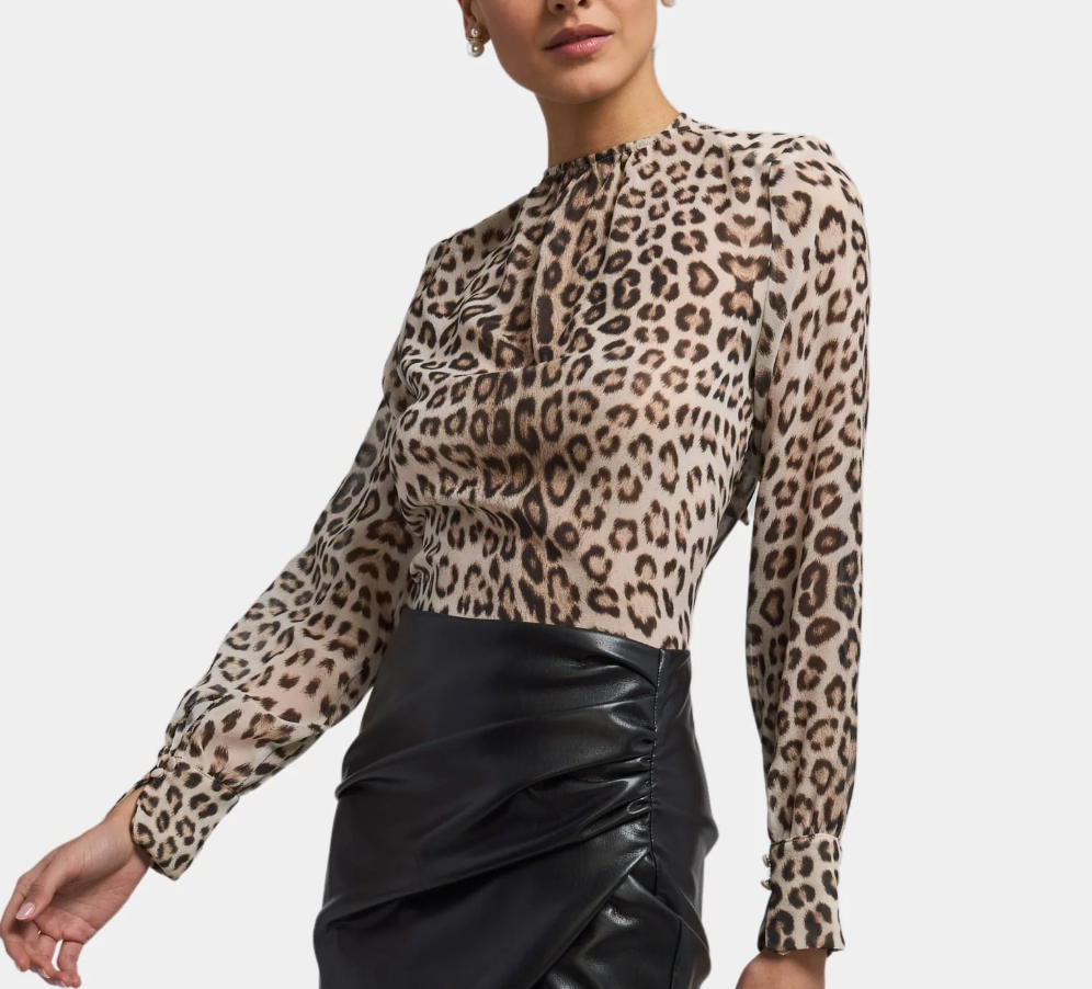 This long-sleeve blouse showcases a bold leopard print, embracing your wild side with style. Made from luxurious chiffon, it's the perfect piece to add a touch of glamour to any look